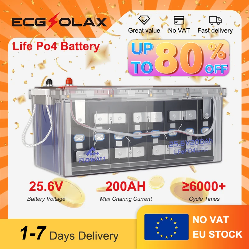 Batteria al Litio FLOWATT LiFePO4 200Ah 25.6V con BMS 200A, Batteria al Fosfato di Ferro e Litio per Accumulo, RV, Auto, Solare, Barca, 5120WH