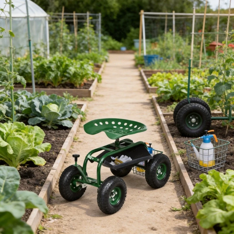 Sgabello mobile con ruote per orto e serra, ideale per il giardinaggio e il trasporto di attrezzi
