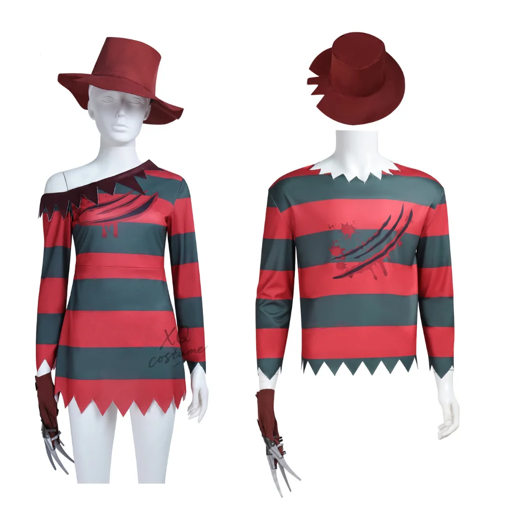 Costume da Freddy Krueger per Adulti, Abito a Strisce Rosse e Nere con Cappello e Guanti con Artigli Affilati, Set per Uomo e Donna