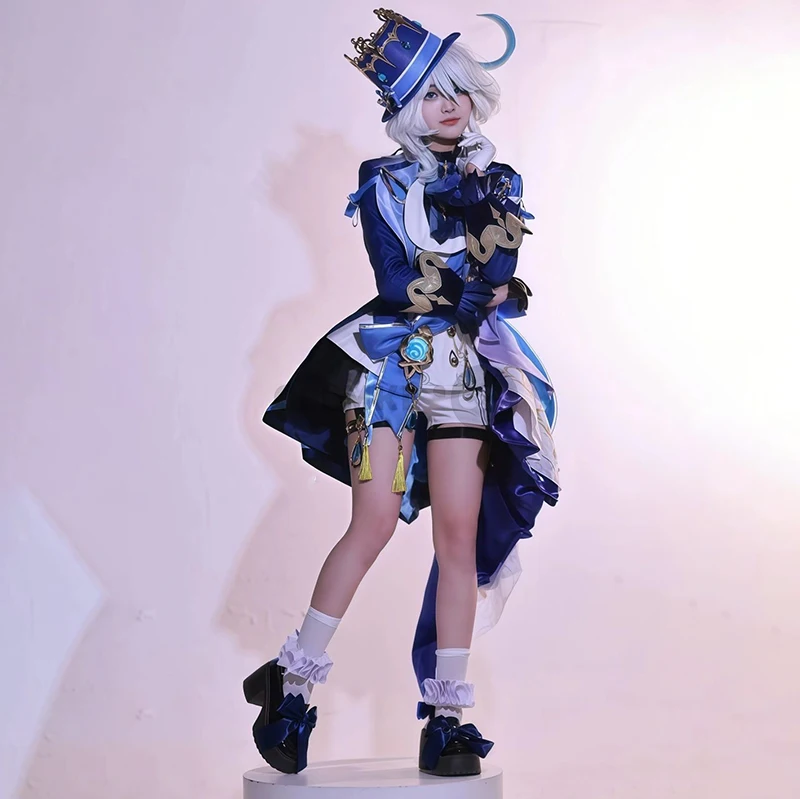 Furina Costume Cosplay Parrucca Capelli Impatto Fontaine Focalors con Cappello Abiti Neri Scarpe Cosplay Tacco Alto per Abiti da Donna