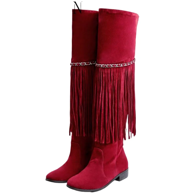 Stivali sopra il ginocchio Moda donna Nappa Catena Punta tonda Tacco spesso Ginocchiere Nero Rosso Marrone Stivali lunghi DL6-27