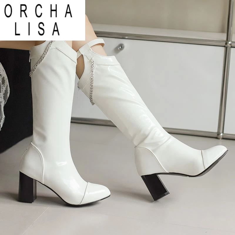 ORCHA LISA Stivali al ginocchio da donna con punta a punta, tacco a blocco da 7,5 cm, decorazione a catena, taglie forti 46 47 48