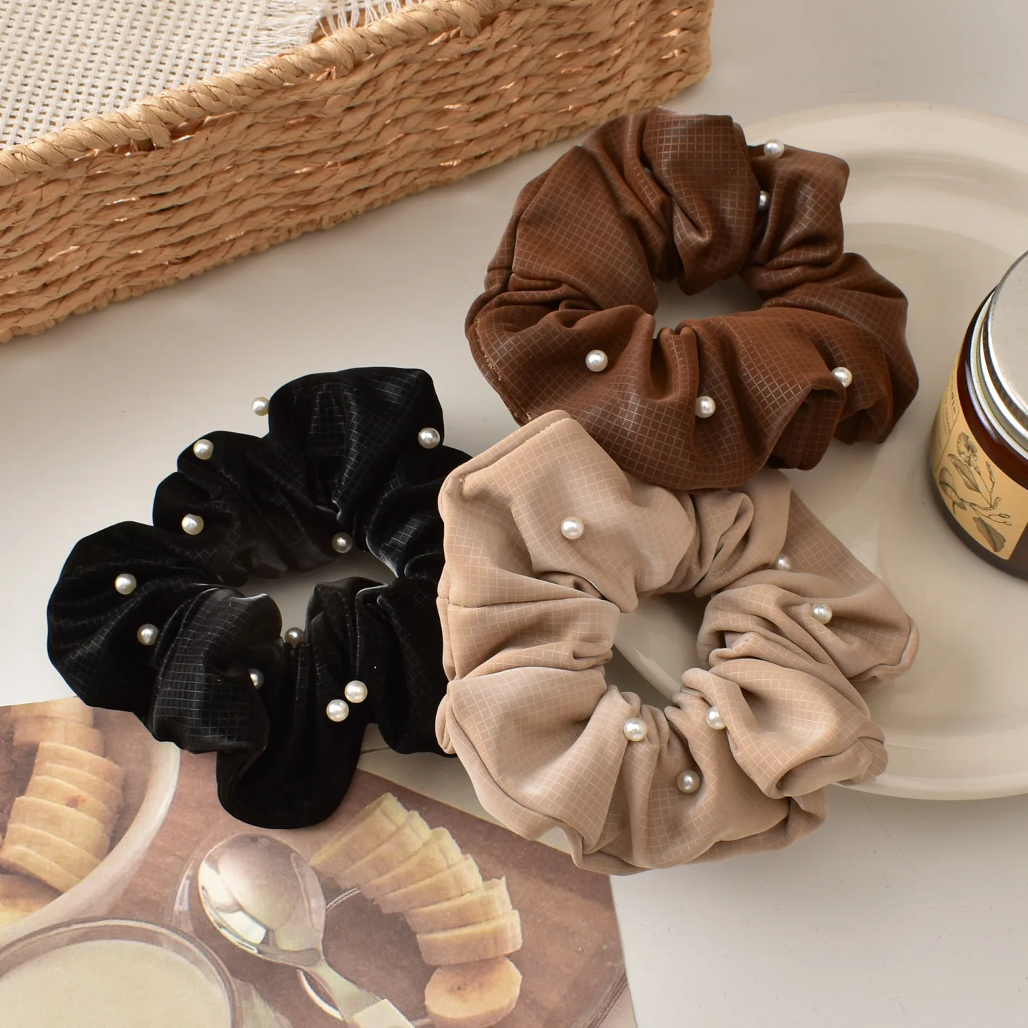 Elastici per Capelli in Ecopelle Autunno/Inverno con Perle, Marrone e Nero, Accessorio Elegante per Coda di Cavallo