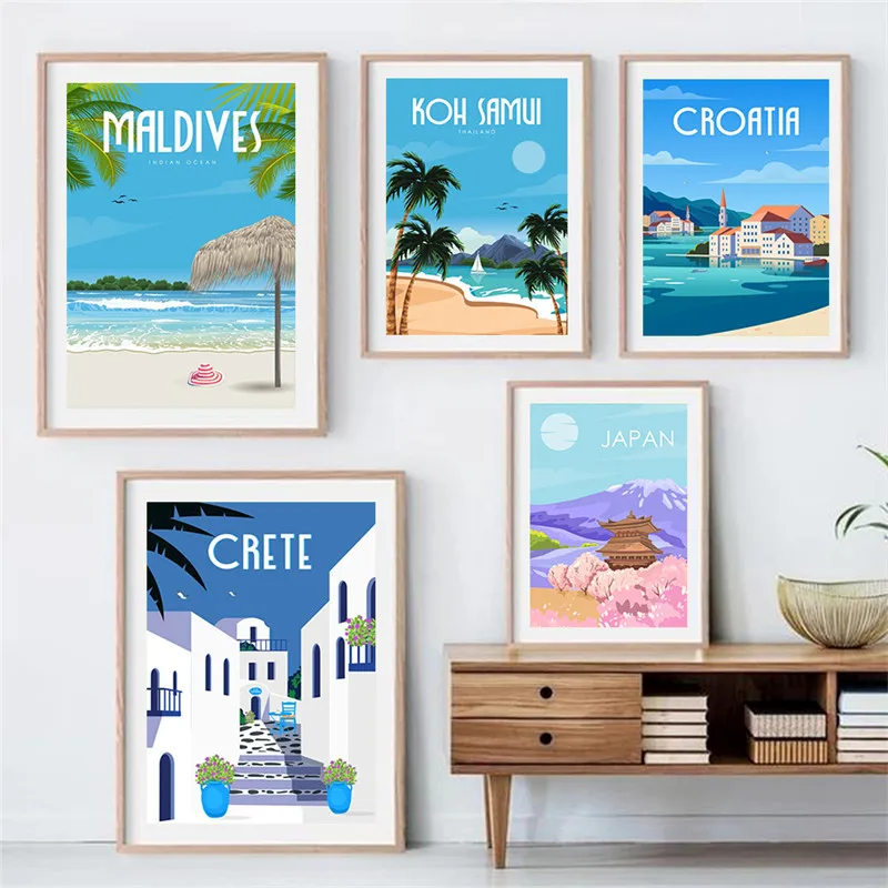 Poster della città del turismo di viaggio Vintage maldive spagna stampe natalizie nordiche di palma per la decorazione di arte della parete del soggiorno