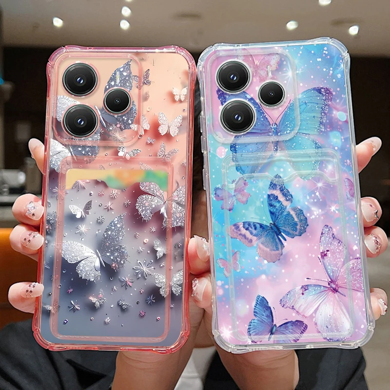 Custodia Trasparente con Tasca per Carte per Xiaomi Poco X7 X6 Poco X6 Pro M6 Pro 4G, Cover Morbida Antiurto in TPU con Stampa Farfalla Bling