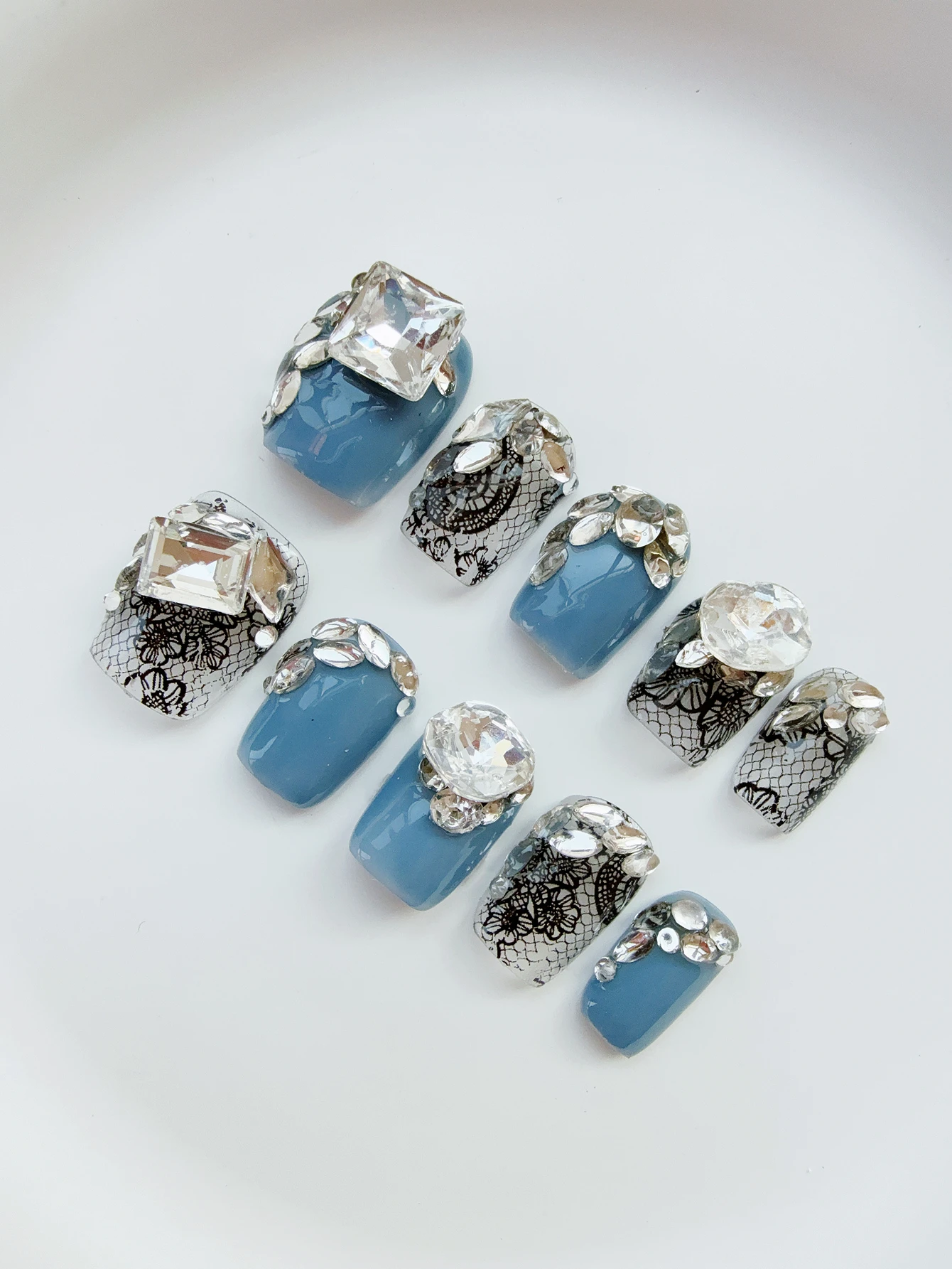 10 pezzi di fascia alta blu pieno di diamanti unghie finte fatte a mano, toppa decorativa per unghie con trapano completo di cravatta blu corta di lusso leggera