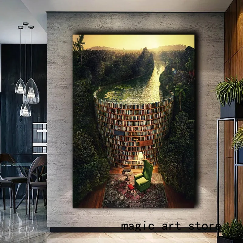 Poster d'Arte Surrealista di Jacek Yerka, Biblioteca sul Mare, Paesaggio Fluviale, Stampa su Tela, Quadro Decorativo per Casa