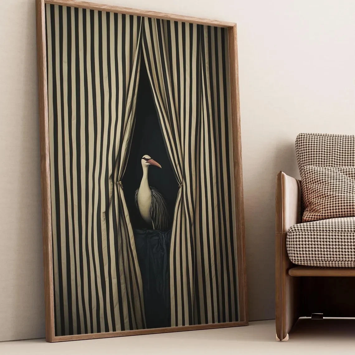 Stampa artistica da parete con uccelli surrealisti, poster illustrativo con tende a righe bianche e nere, opera d'arte astratta moderna, decorazione per la casa