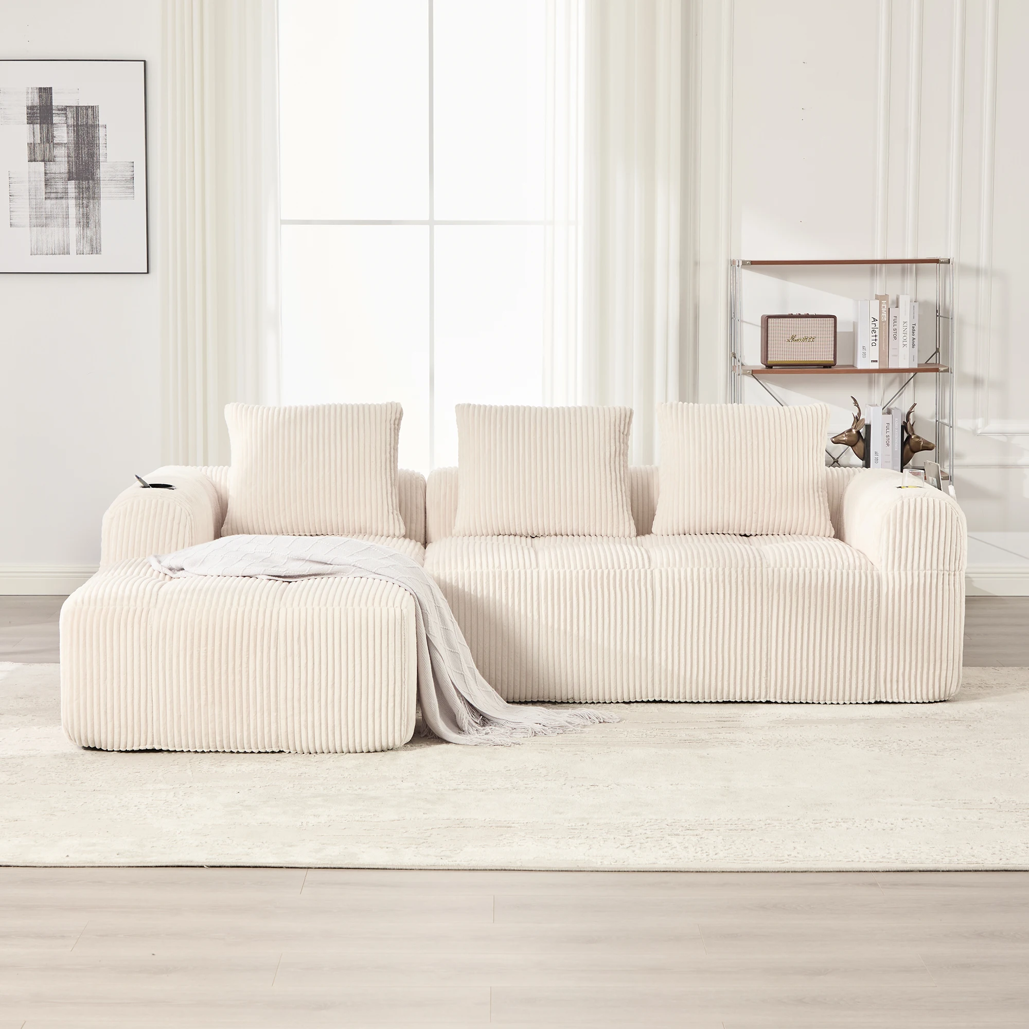 Divano modulare in velluto a coste con portabicchieri e tasca laterale. Divano morbido e compatto con 3 cuscini per soggiorno e ufficio, 2 posti, beige.