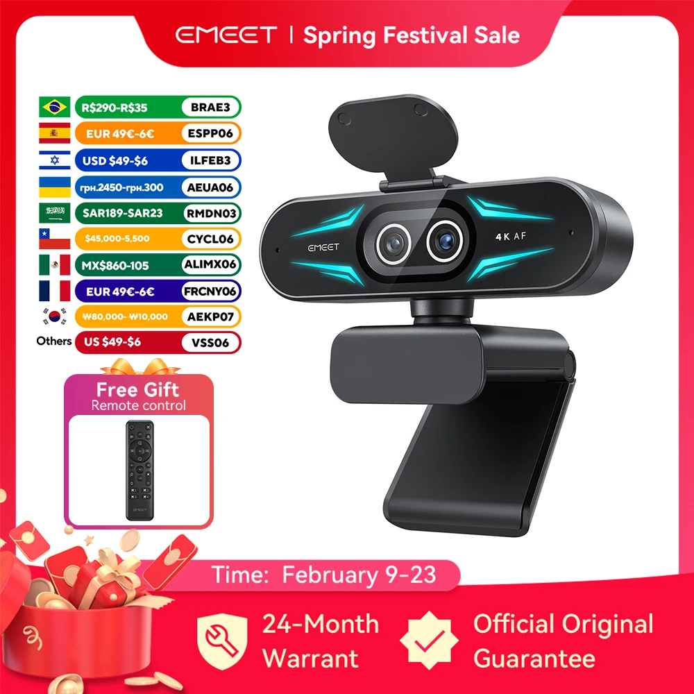 Webcam 4K con Luci 1080P60fps Autofocus Videocamera EMEET S600 Light Fotocamera USB 8MP 73 ° Webcam FOV per Streaming su PC/Computer