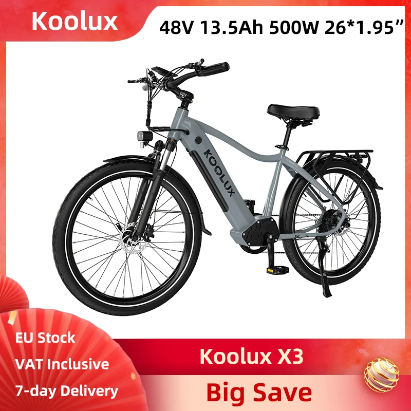 Koolux X3 Bici Elettrica 500W 48V 13.5Ah 26*1.95" Pneumatici Sottili City E-bike Freni Idraulici 40 km/h Sospensione Forcella Anteriore a 7 Velocità