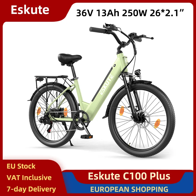 Bici elettrica Eskute C100 Plus 250W 36V 13Ah 26*2.1" Pneumatici sottili Pendolarismo urbano E-bike Freno a disco meccanico 7 velocità 40 km/h Verde