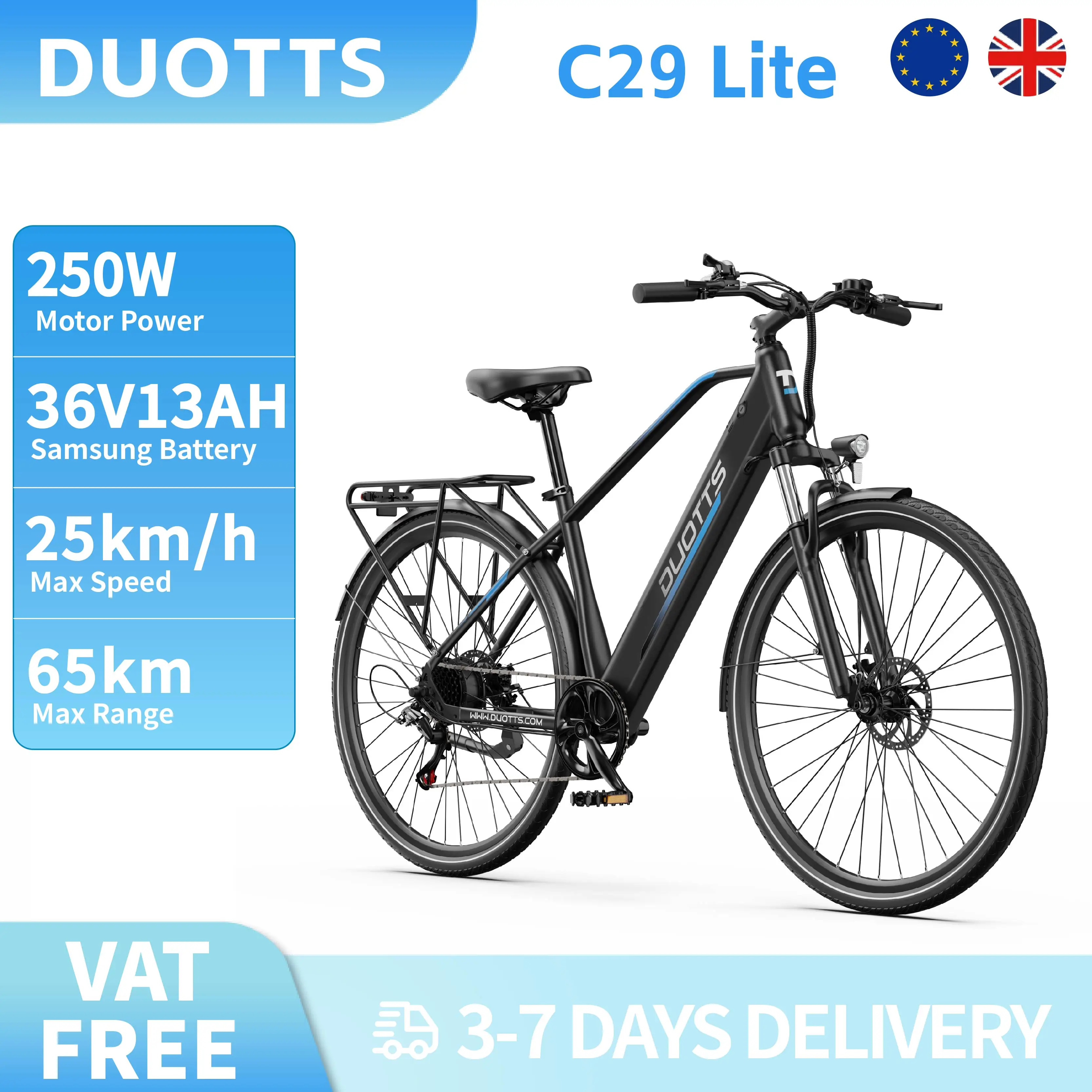 Bicicletta Elettrica DUOTTS C29 Lite 250W 36V 13Ah 27.5" 700C*42C Pneumatici Sottili per Pendolarismo Urbano E-bike 65km 25km/h Freni a Disco Meccanici