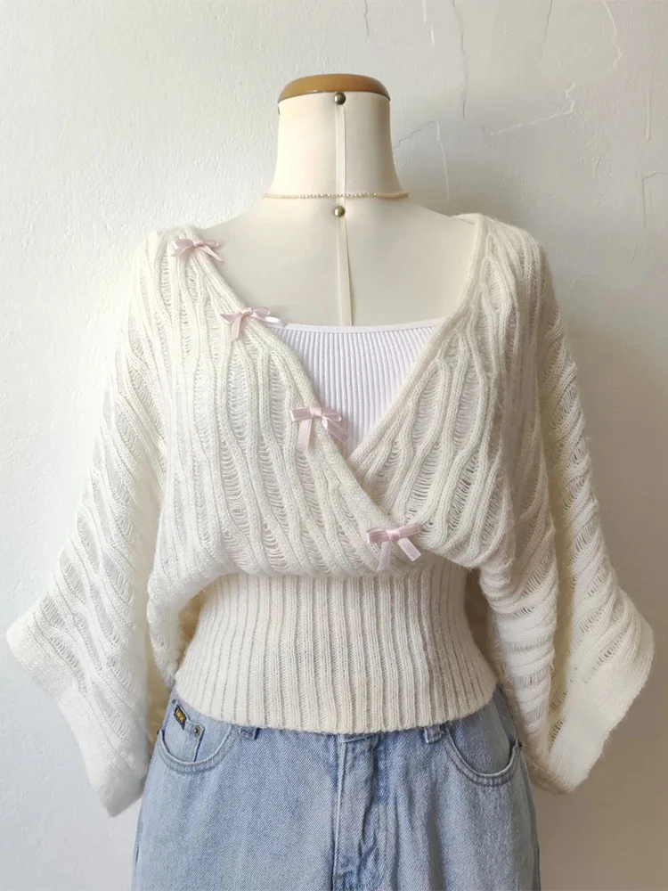Maglione Lavorato a Maglia con Scollo a V e Maniche a Pipistrello, Design Originale Vintage, in Misto Cotone, Bianco con Motivo a Vite di Pera, da Donna, per Inizio Autunno