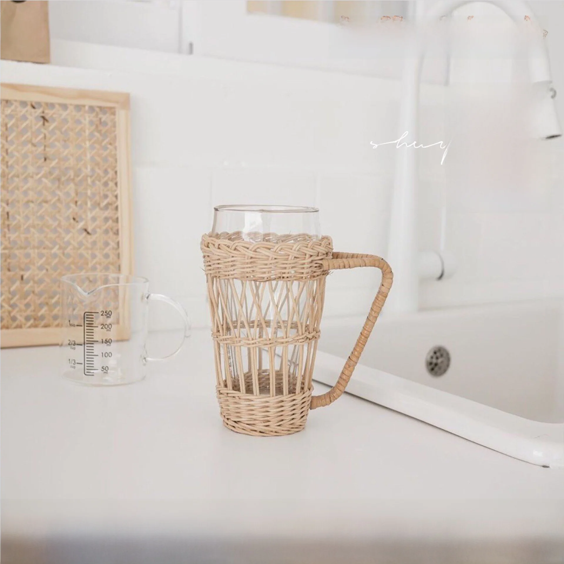 Coperchio per tazza in vetro con manico a cesto in vimini bianco indonesiano, protezione dal calore, design artigianale indonesiano stile INS