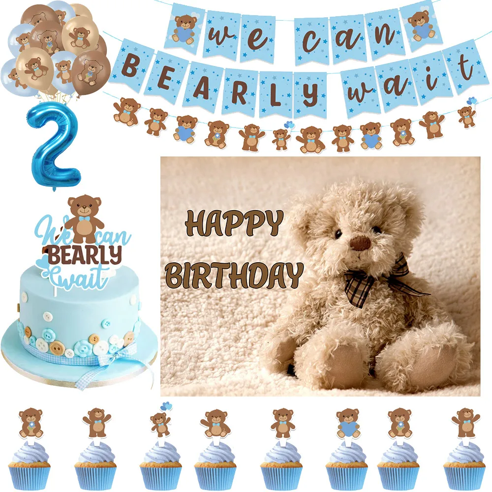 Cartoon Blue Teddy Bear decorazione per feste di compleanno Supplie decorazione per torte Banner numeri palloncino sfondo vestito Baby Shower