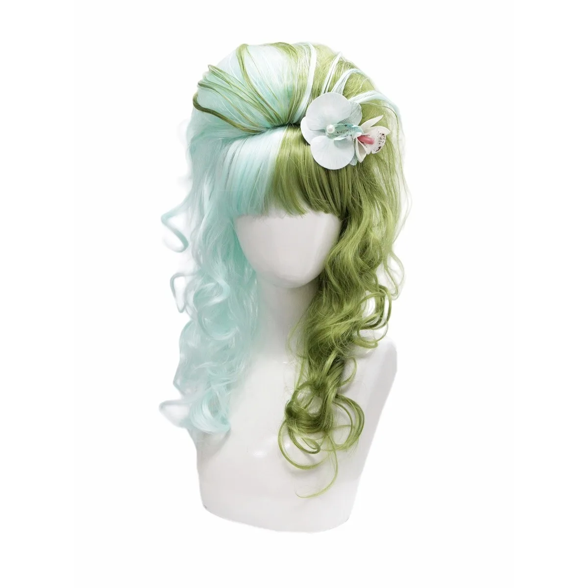 Parrucca sintetica per capelli ricci Lolita con doppia frangia azzurra e verde | forma di testa con accessori di fiori bianchi