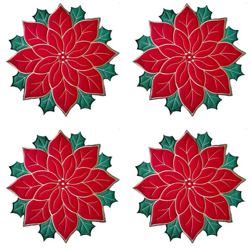 Tovagliette ricamate natalizie Hot Trend-Holiday Tovagliette Poinsettia con applique Tovagliette con fiori natalizi per la decorazione della tavola