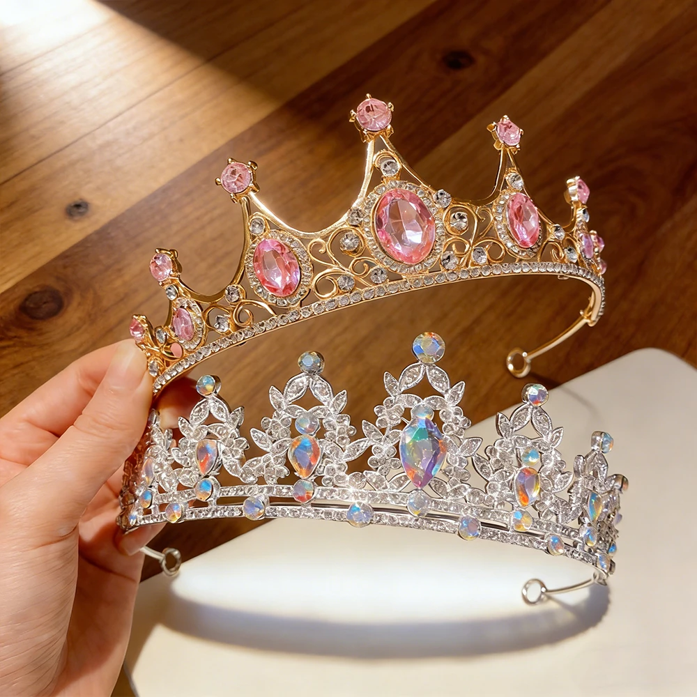 2 Pezzi Corone per Capelli con Basi Oro e Argento, Dettagli in Gemme Iridescenti e Strass, Design Scintillante per Eventi Speciali