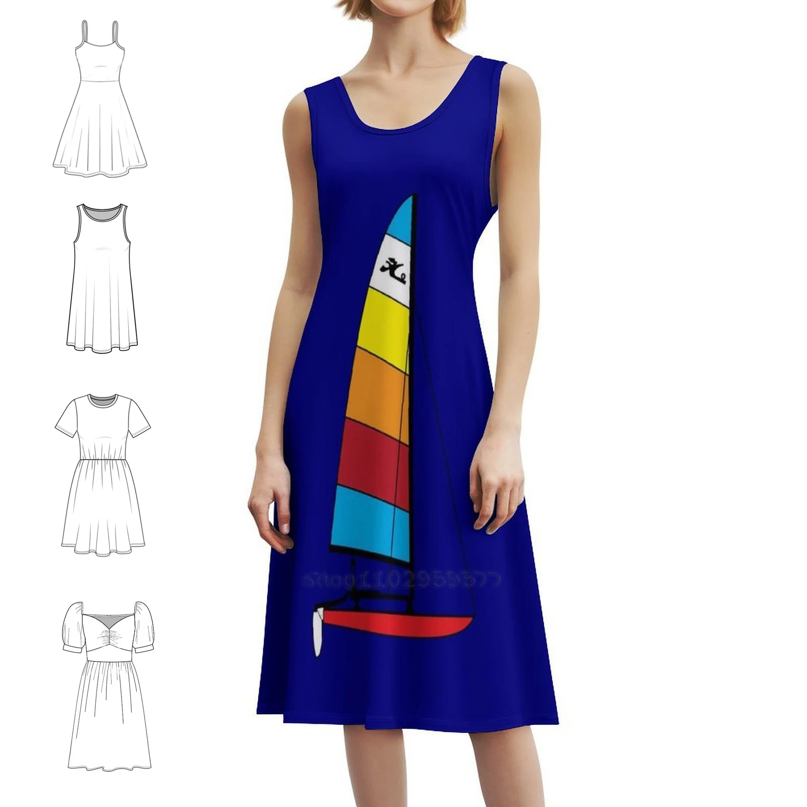 Hobie 14 Catamarano Barca a vela-Rosso Abito bohémien senza maniche Multi-Stampa Vacanza al mare Abito da festa Barca a vela Barca a vela