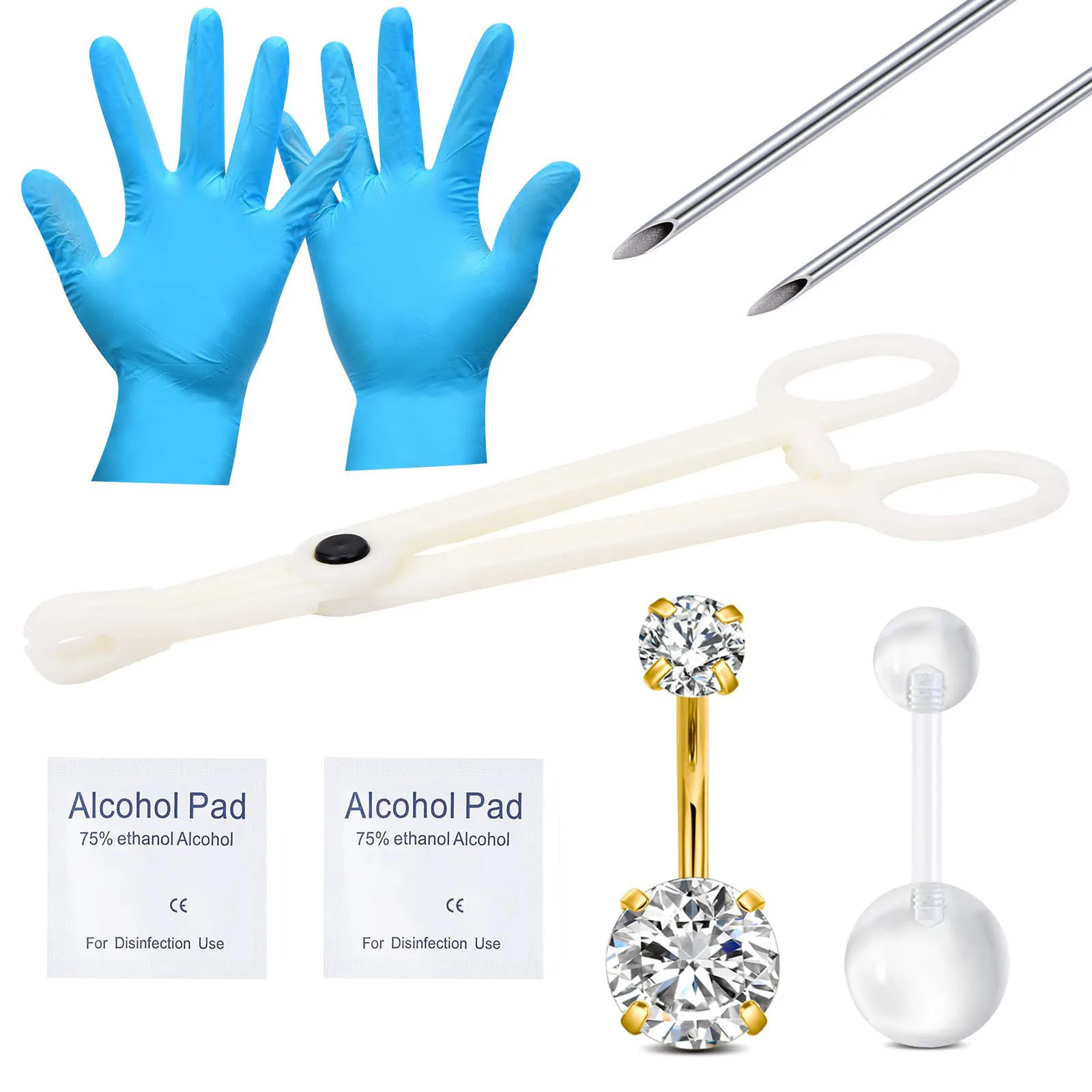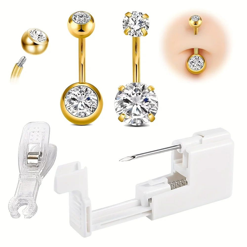 Kit per piercing all'ombelico in acciaio inossidabile 14G con anello per pancia dorato e accenti di strass include pistola per piercing e morsetto Kit da 5 pezzi