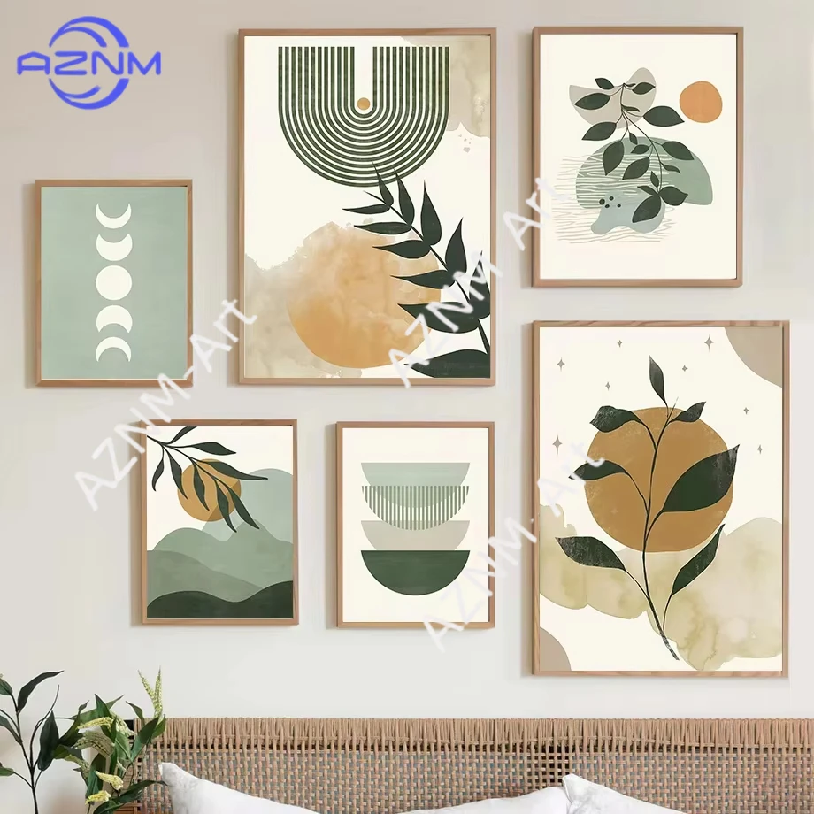 1 Pezzo/6 Pezzi Poster e Stampe con Montagna Verde, Sole, Arcobaleno, Fiori e Foglie, Arte Murale Geometrica su Tela per Decorazione Soggiorno