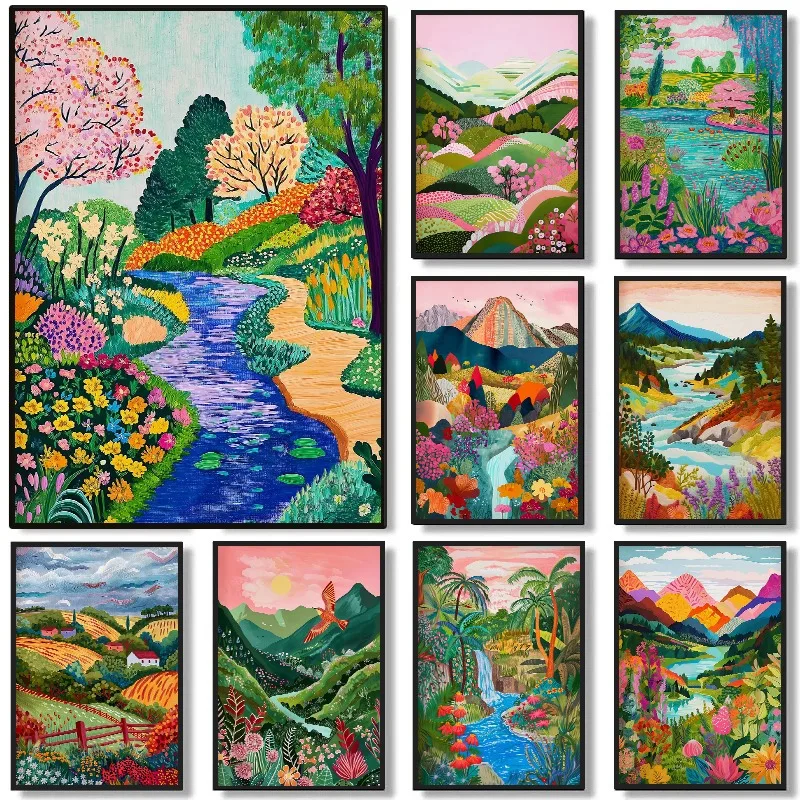 Poster di Paesaggio Tropicale Astratto e Colorato, Montagne, Fiume, Piante, Alberi, Bellissimo Scenario, Dipinto su Tela, Arte Murale per Decorazione Casa