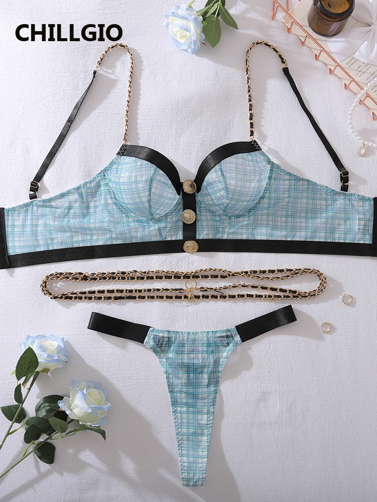 CHILLGIO Donna Sexy Vintage Plaid Stampa Reggiseno Breve Abiti Reggiseni Mutande Bottone Moda Intimo Lingerie Catena Set di biancheria intima