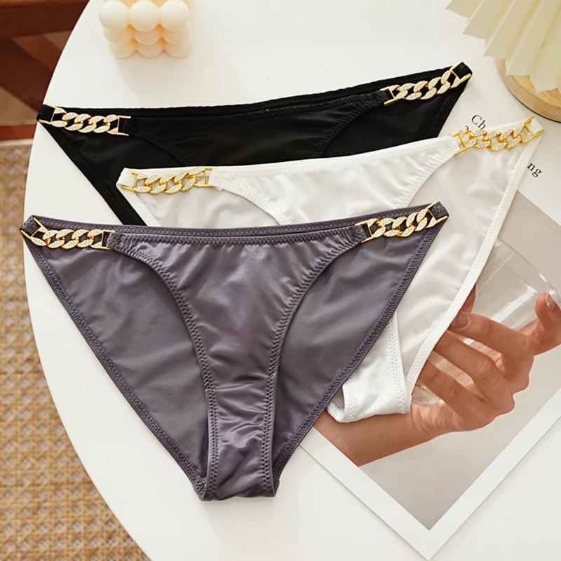 Lingerie sexy in raso francese per donna Mutandine a vita bassa in metallo con catena intarsiata di diamanti Nuove mutande a triangolo senza cuciture