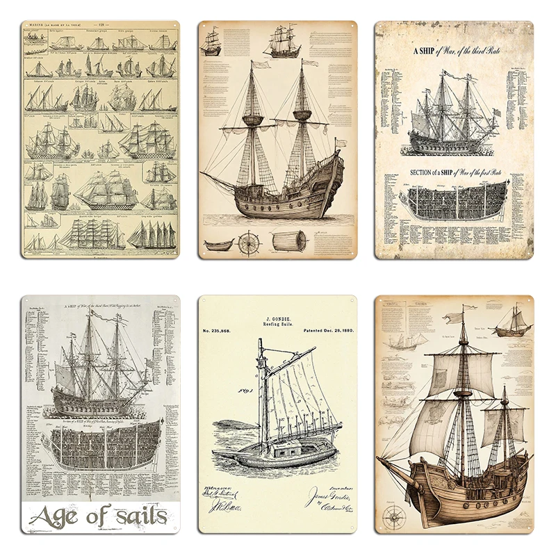 Age of Sails navi a vela vintage francesi Progetto di barche 1 Disegno di Leonardo da Vinci Design in metallo Cinema vintage Targa in metallo Poster