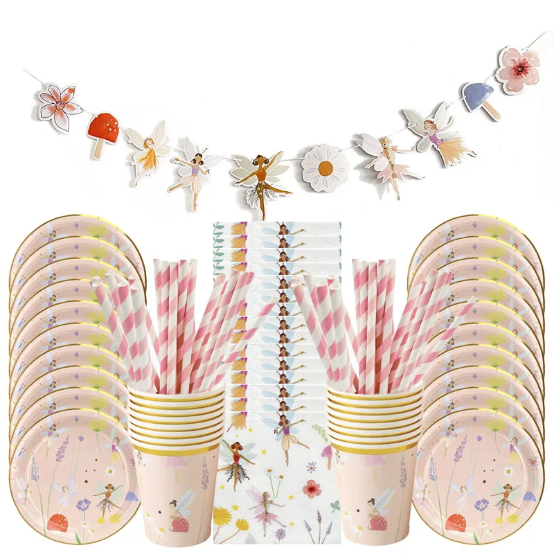 Set di stoviglie usa e getta per feste fatate Piatti di carta Bicchieri Cannucce Tovaglioli Banner fatato per ragazze Decorazioni per feste di compleanno Baby Shower