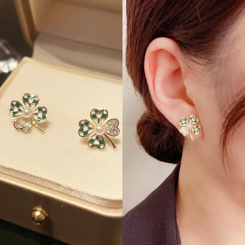 Orecchini in Argento S925, Design Semplice con Diamanti Incastonati, Quadrifoglio Verde a Quadretti, Gioielli Delicati e Versatili