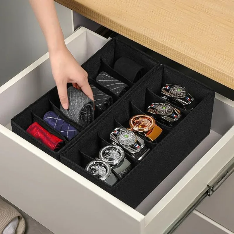 Organizzatore di cinture e cravatte in tessuto nero da 3 pezzi, portaoggetti per cassetti per l'organizzazione dell'armadio, supporto pieghevole in tessuto non tessuto per comò