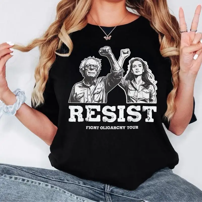 Maglietta The Fight Oligarchy Tour 2025 Bernie e Aoc protesta politica audace