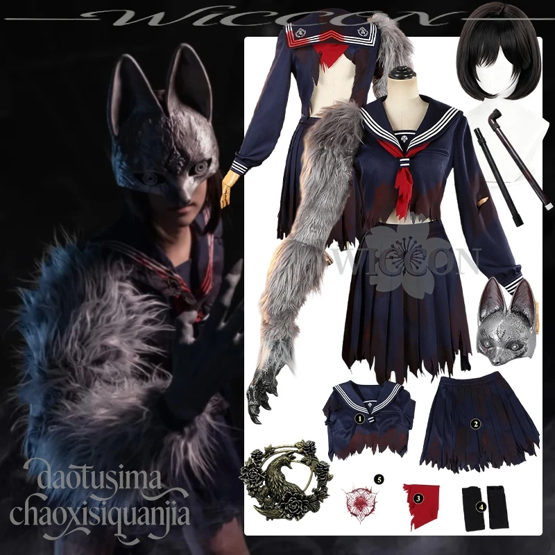 Gioco horror F Cosplay Hinako Costume anime Uniforme scolastica giapponese JK Abito Puntelli zampa pelosa Maschera di volpe Spilla Tatuaggi Halloween