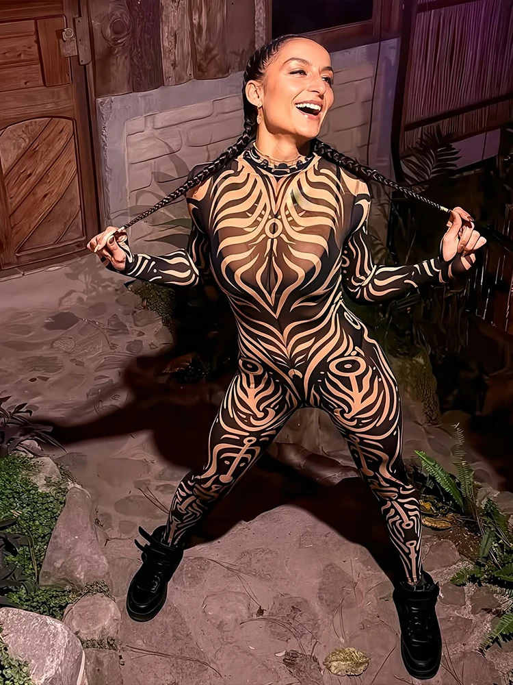 2025 Autunno Inverno Serpentine Stampa Piedi Tute Skinny Donna Selvaggio Sexy O Collo Manica Lunga Pesca Fianchi Night Club Tuta