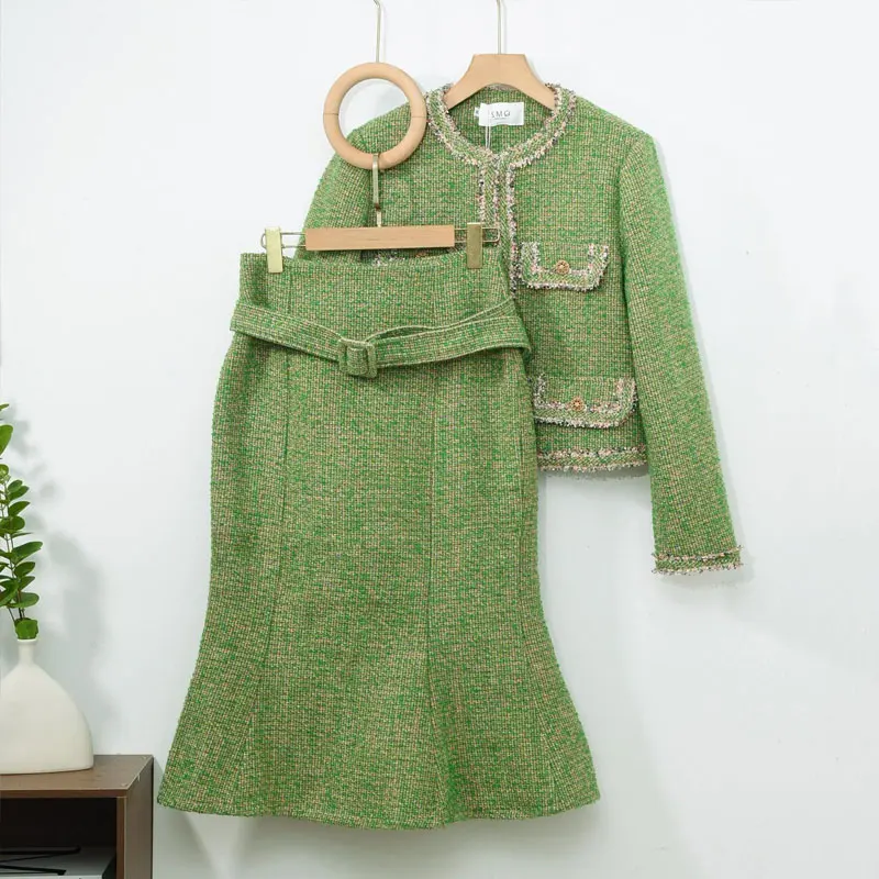 2 pezzi di giacca verde di lana grossolana + gonna anca avvolta con coda di pesce 2026 nuovo stile piccolo set atmosfera profumata