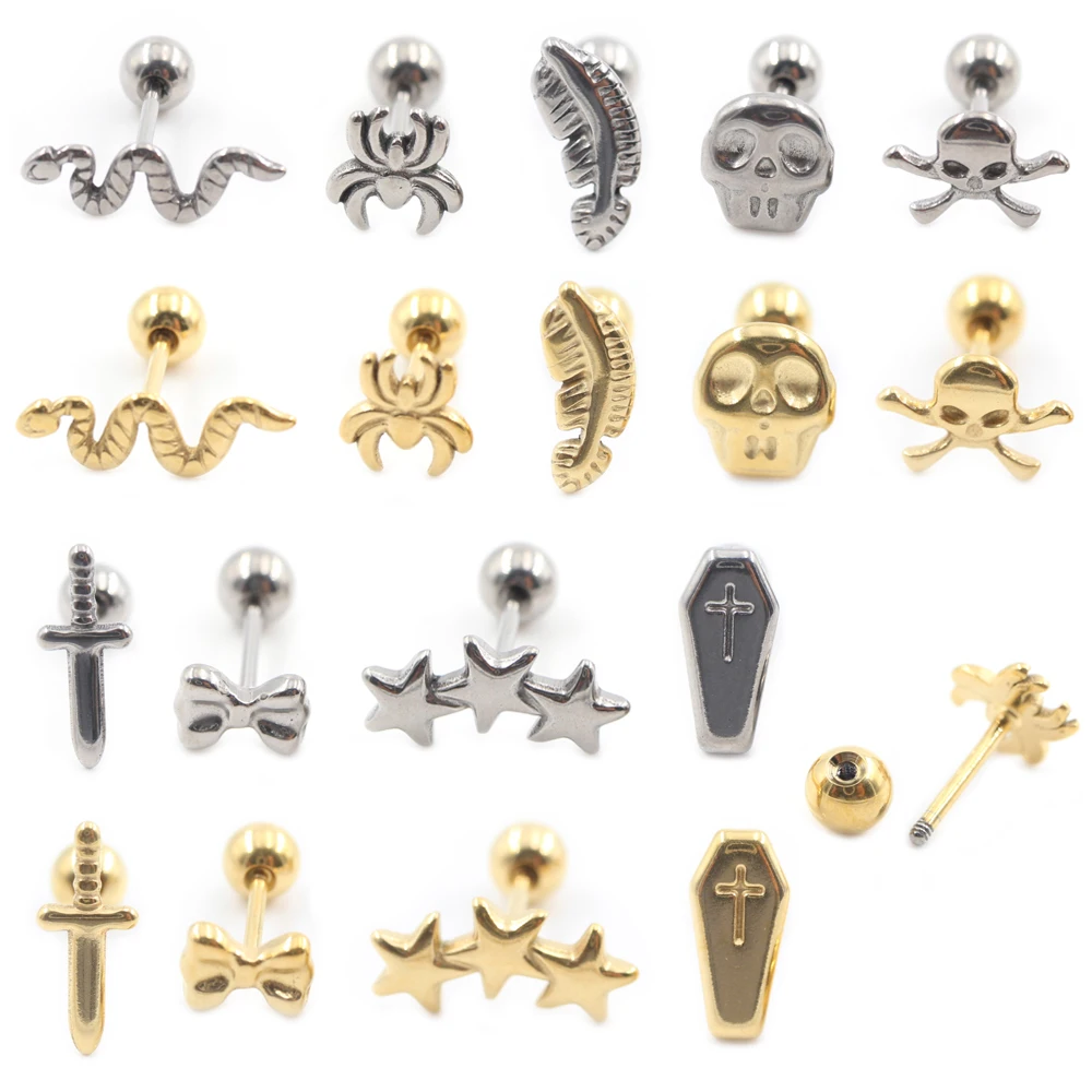 2 Pezzi Gioielli Piercing in Titanio: Orecchini a Perno (Crocifisso, Ragno, Serpente, Teschio, Spada, Arco, Piuma, Stella, Bara) e Piercing per Lingua