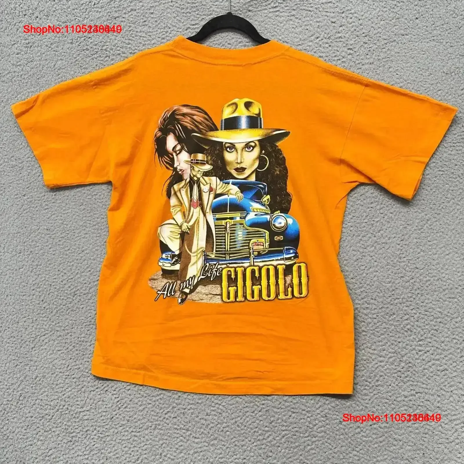 Y2K Chicano T Shirt Uomo L Arancione Gigolo Pimp Mafia Gangster Ragazze Sexy Cars Boot vintage Lavato Grafica morbida Allungata