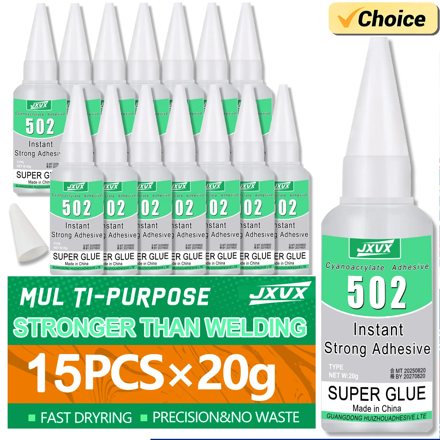 15 pezzi di colla super 502 a presa rapida, cianoacrilato trasparente, adesivo per pelle, gomma, legno, metallo e vetro; colla liquida per vetro ad alta viscosità; con dosatore di precisione, 20 g (0,7 oz).