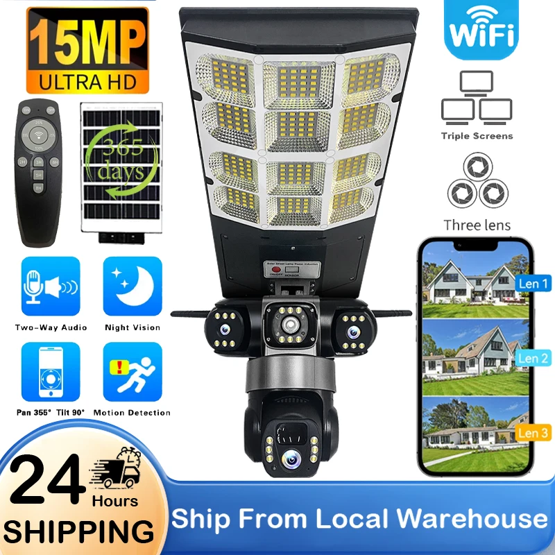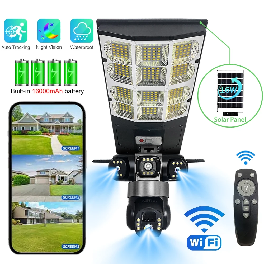 Solar WIFI Lampione stradale Telecamera HD 15MP Zoom 10X Registrazione a tre obiettivi Monitoraggio umanoide Telecamere esterne Lampada a LED Telecomando