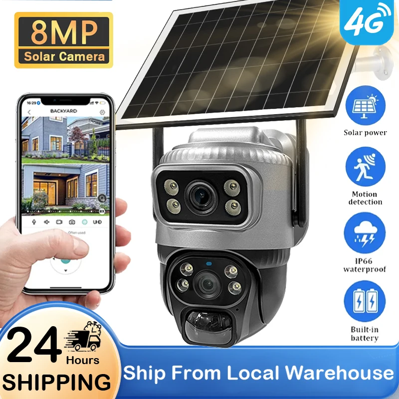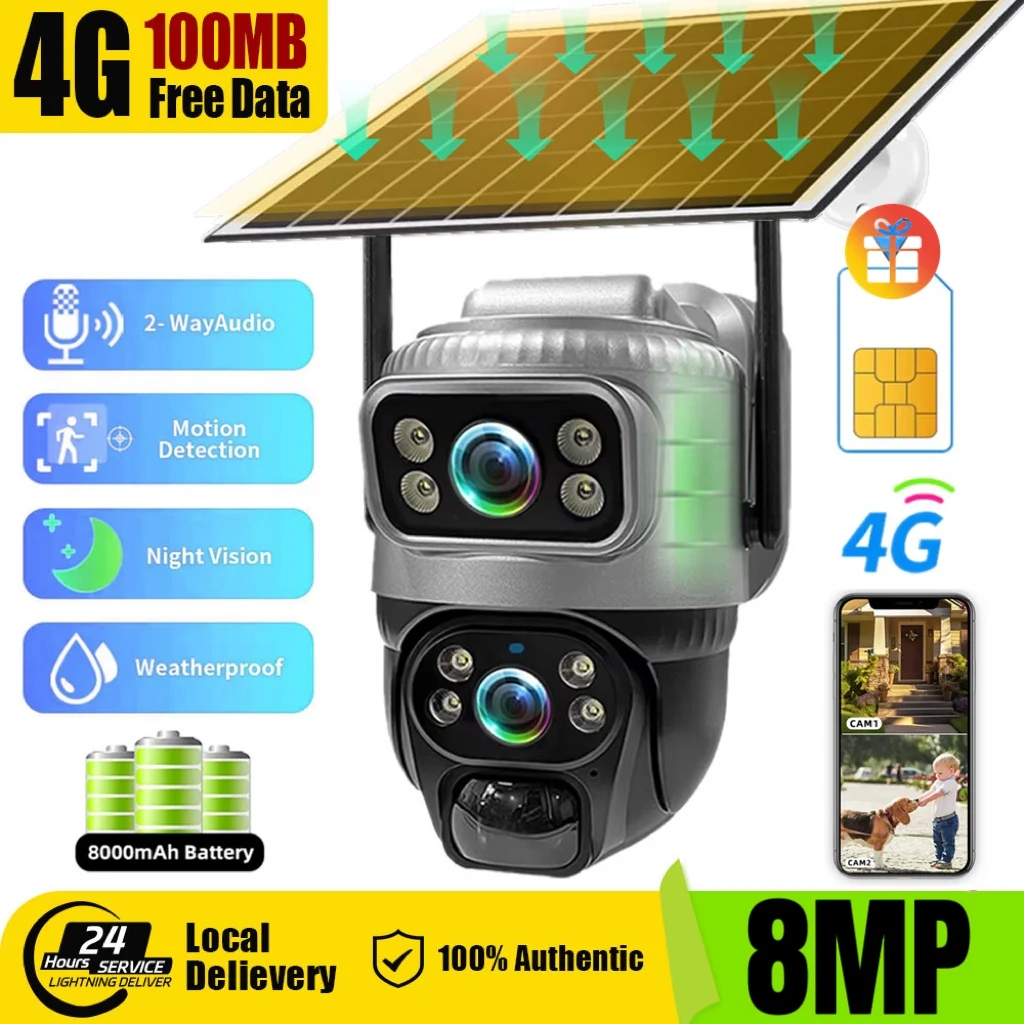 Telecamera solare 4G con scheda SIM 8MP 4K Doppia lente Monitor a doppio schermo Visione notturna Protezione di sicurezza Video sorveglianza PTZ