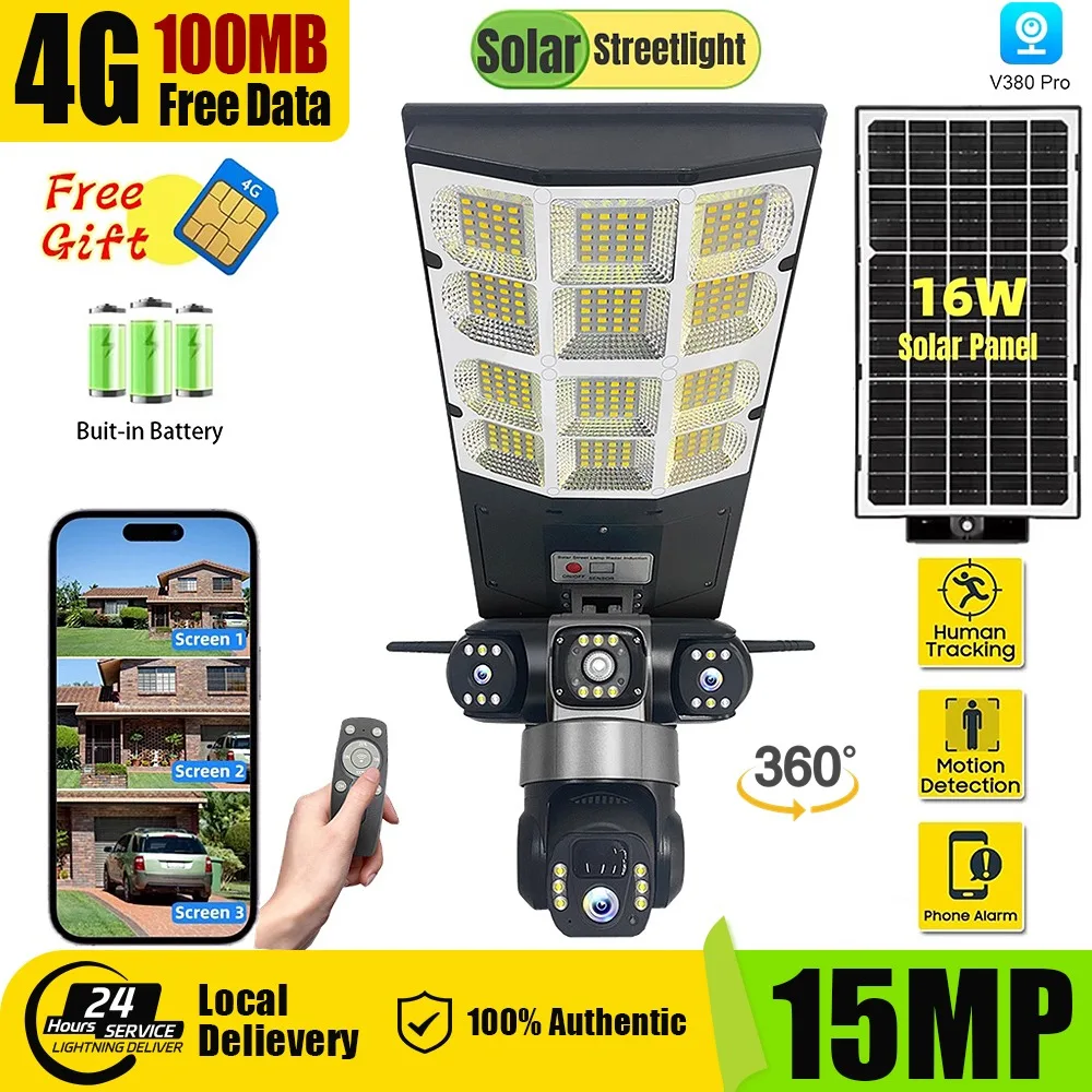 Telecamera solare esterna 4G Tripla lente Impermeabile PIR Rilevazione umana Visione notturna a colori Lampione stradale a LED V380 Pro Telecomando