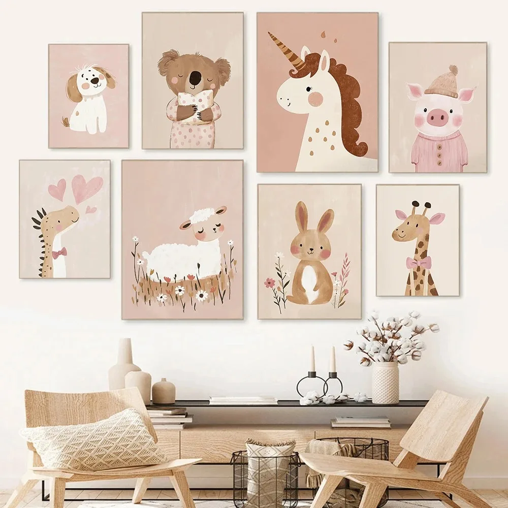 Nordic Rosa Simpatico Cartone Animato Animale Volpe Unicorno Illustrazione Poster Stampe Su Tela Pittura Soggiorno Home Decor
