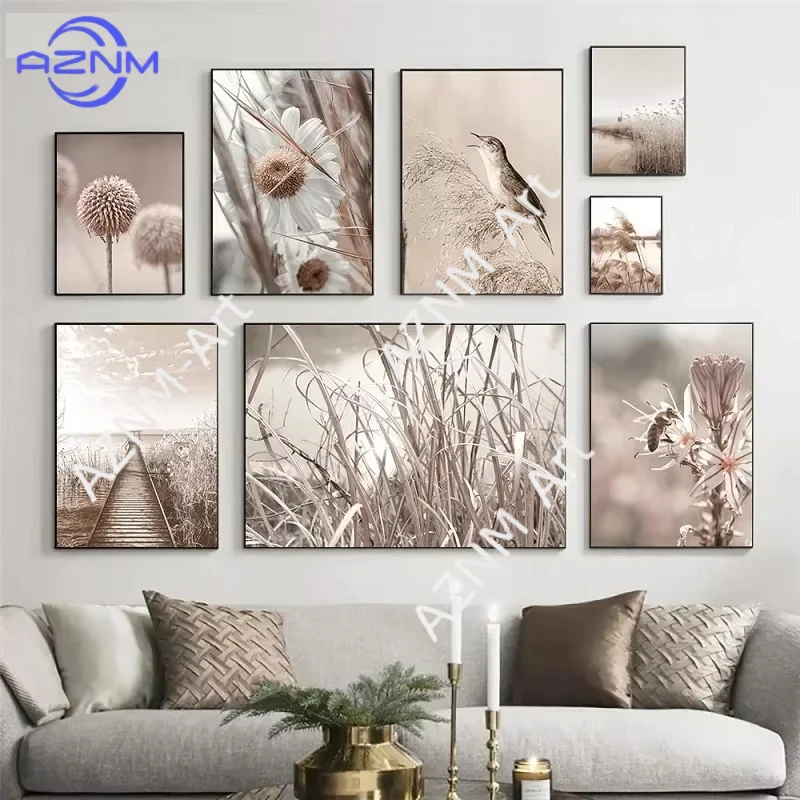1 Pezzo, Poster Nordico Beige con Paesaggio, Canna, Fieno, Ponte, Uccelli, Bue, Volpe, Stampa Artistica su Tela