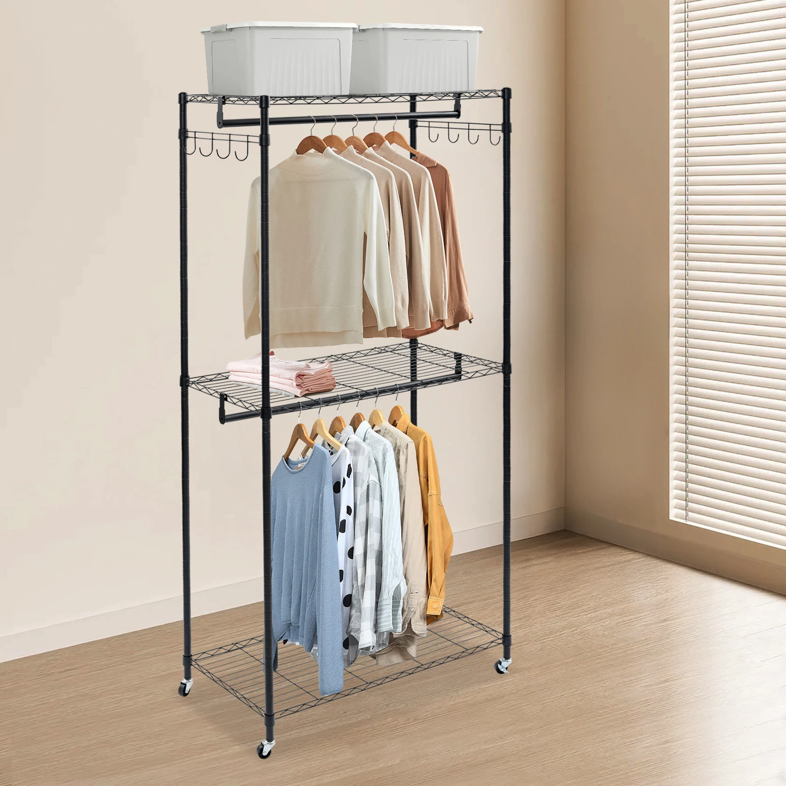 Organizzatore per armadio con asta a 2 livelli 90 * 43,5 * 180 cm, appendiabiti, appendiabiti con ruote per camera da letto con 4 ruote universali
