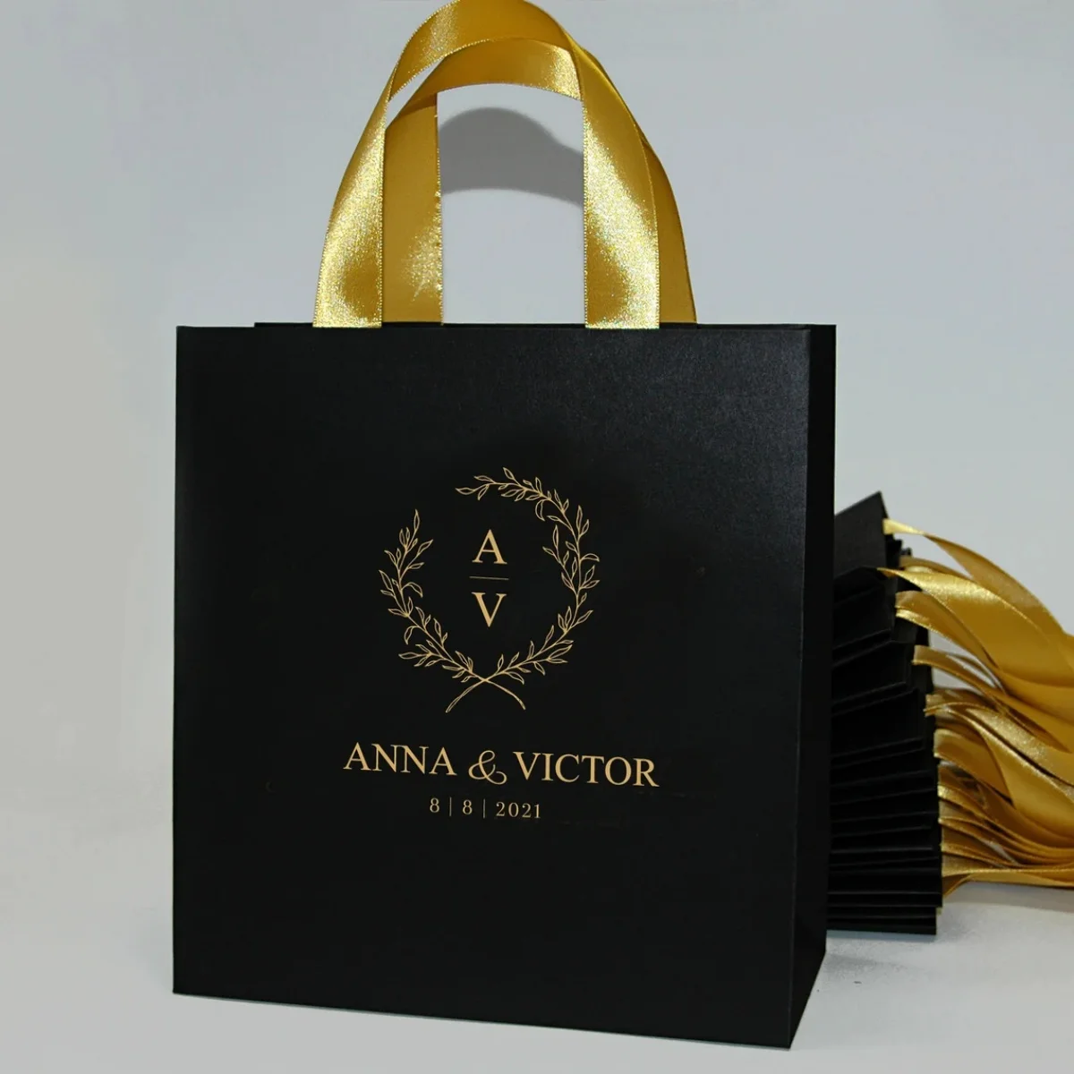 Borse di benvenuto per matrimonio dorato con manici in nastro di raso e i tuoi nomi, bomboniera elegante personalizzata per i tuoi ospiti, matrimonio