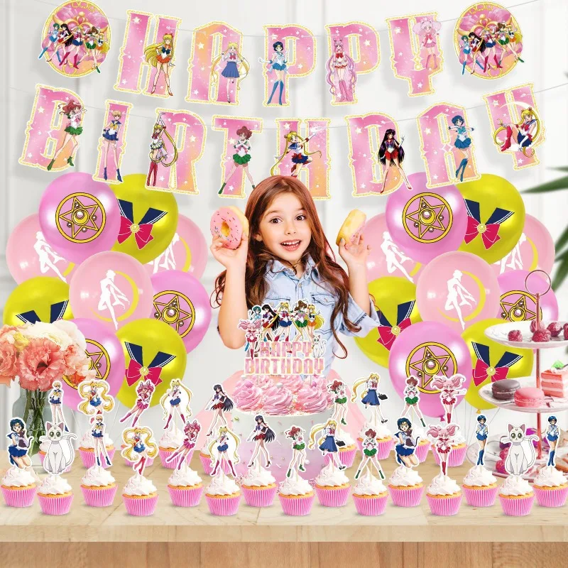 Sailor Moon Forniture per feste Palloncini Kawaii Banner Toppers per torte Set di viti per appendere Decorazioni per feste di compleanno per cosplay per ragazze per bambini