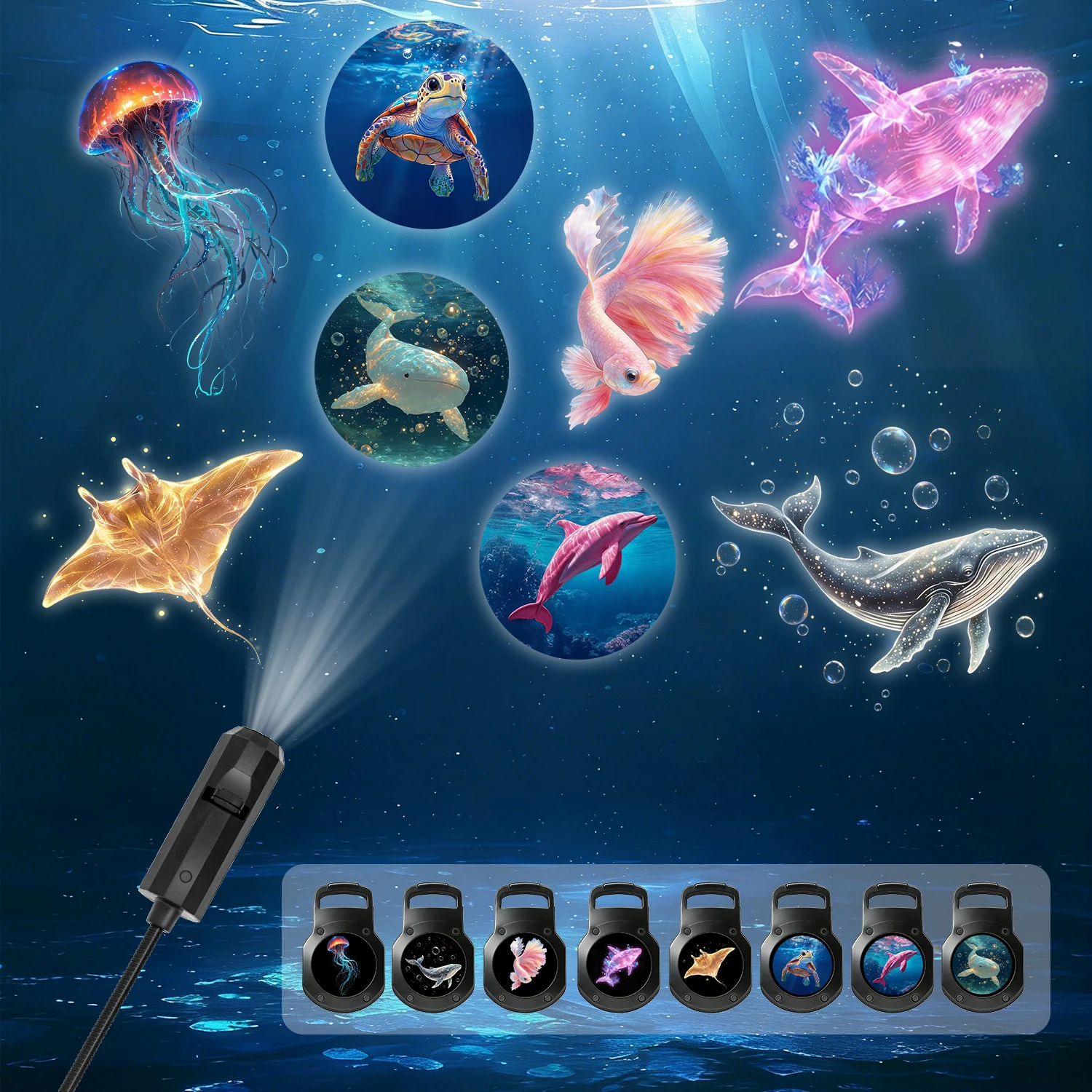 Proiettore portatile di luce marina, con 8 pannelli luminosi tra cui meduse, balene e tartarughe marine; alimentato tramite USB, 360°. ° putrido