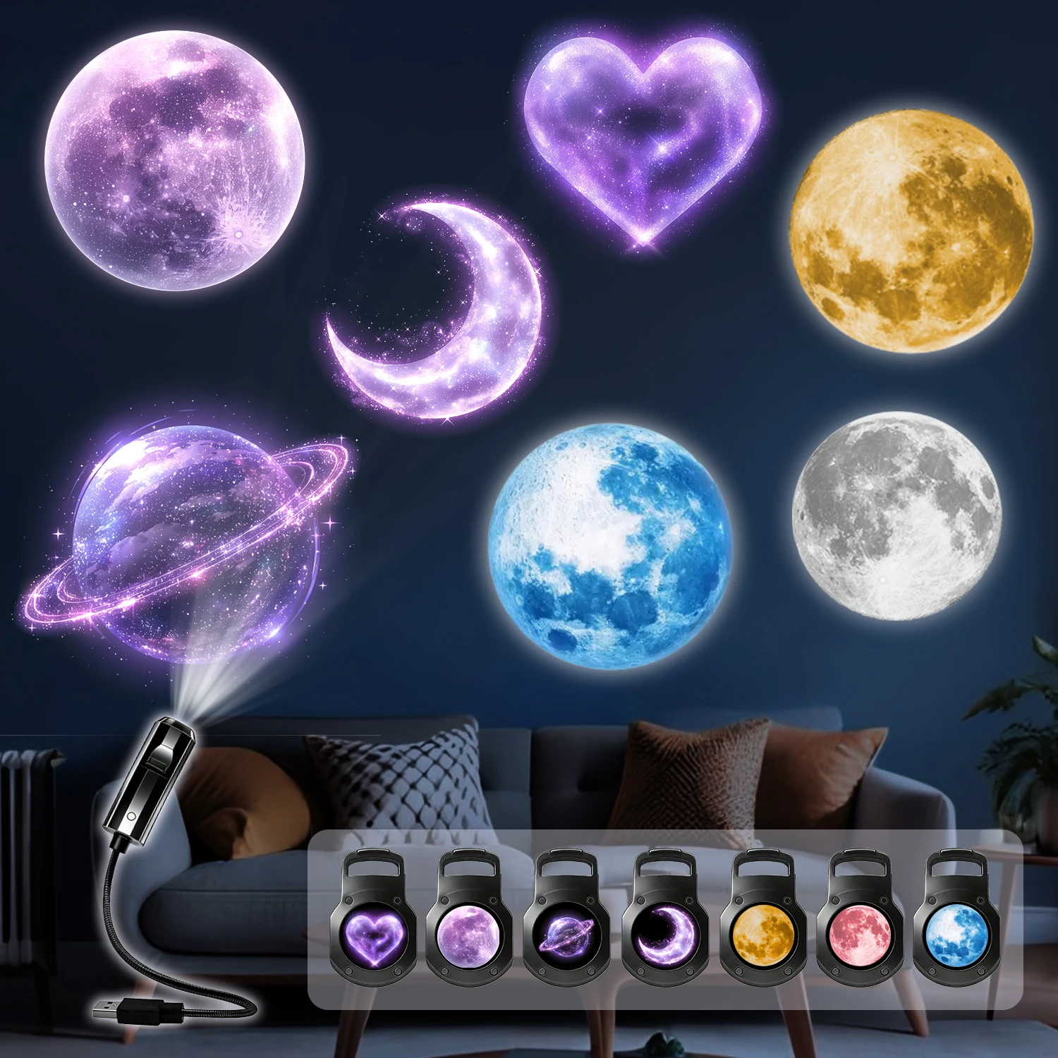 Sette luci di proiezione a tema, inclusi modelli di pianeti/luna crescente, da utilizzare come luci ambientali a soffitto.